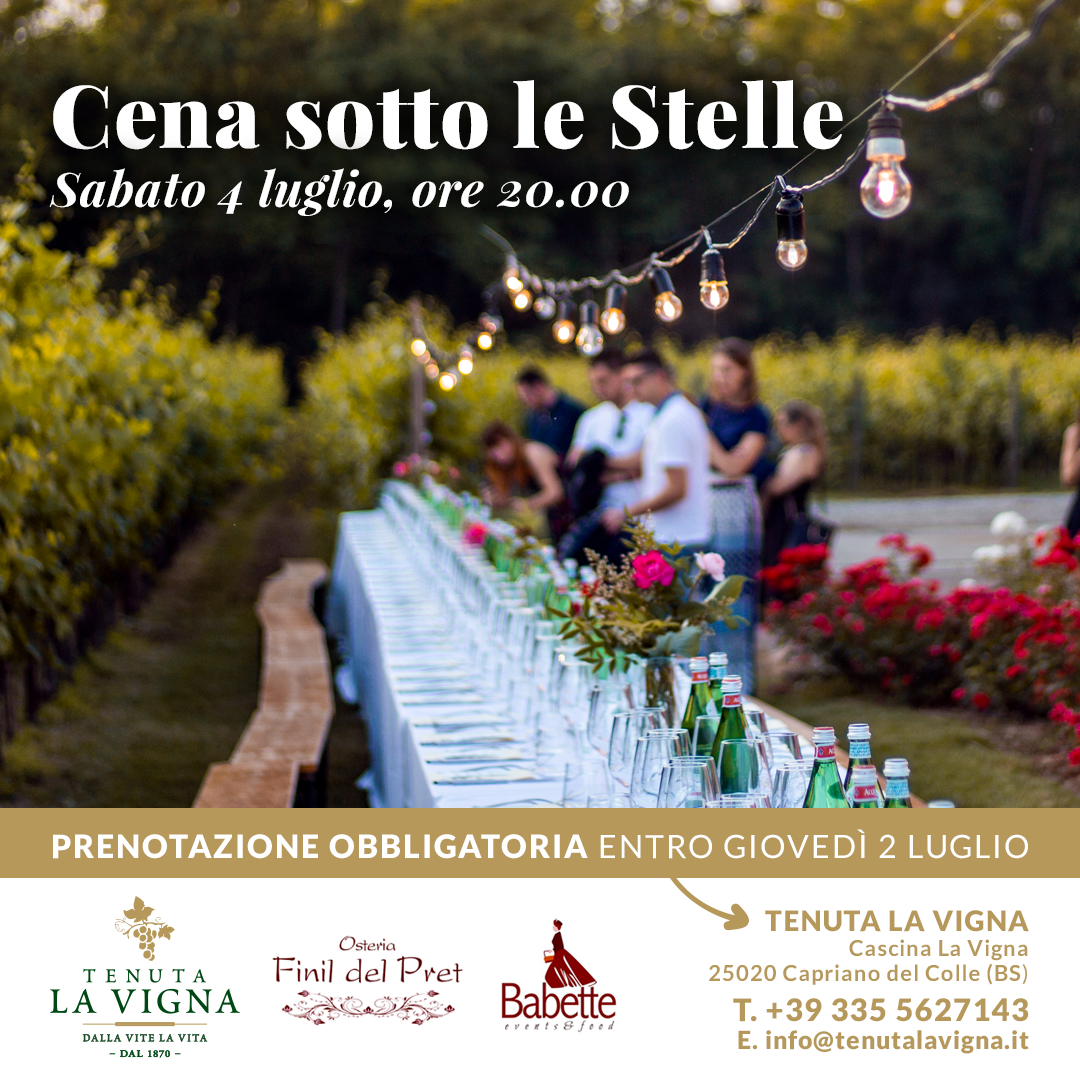 Sabato 4 Luglio dalle ore 20.00, quarta edizione della “Cena sotto le Stelle” organizzata da Tenuta la Vigna in collaborazione con Finil del Pret e Babette Events & Food.